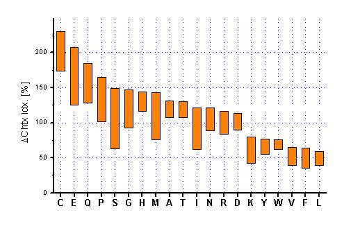 Investigation of the physicochemical properties of the chemotactic amino acids demonstrate that relatively high pK values of N-terminus are preferred in chemoattractant (e.g. Cys, Glu, Pro, Gly), while this character is decreased in chemorepellents (e.g. Tyr, Trp, Val, Phe). Negative hydropathy indices of chemoattractant amino acids are also characteritic: increasing this value results intermediate and chemorepellent moieties in these small ligands. Surface expressed area (SEA) of the whole ligand or the available sidechain proved to determine chemotactic ability of amino acids or oligopeptides. In these cases low surface values have good correlation with the increased chemoattractant ability (Kõhidai et al. Cell Mol. Biol., OL 49: 2003).