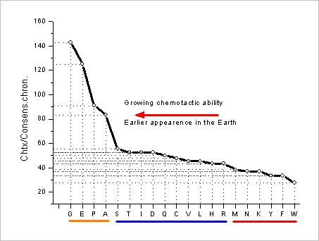 Comparative study of chemotactic ability and the consensus chronology of amino acids Trifonow (1999) shows a good correlation between chemotactic capacity of the ligands and their appearance in molecular phylogeny. The earlier amino acids proved to be the best chemoattractants (Gly, Pro, Glu) which supports the theory that chemotaxis should play a fundamental role in the turn of prebiotic-biotic period of evolution. (Kõhidai et al., Eur.J.Protistol.in press)