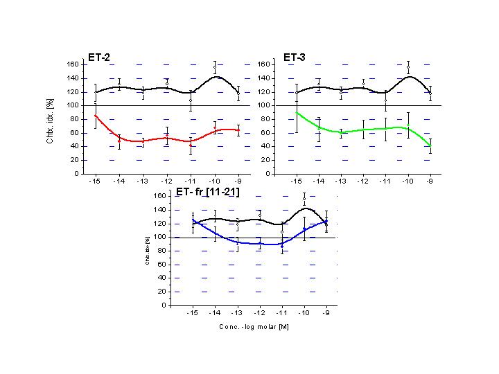 Chemotaxis induced with endothelins. Black line represents ET-1 - the only wide range chemoattractant endothelin derivative. Presence of aromatic amino acids in the loop-region of the molecule (ET-2 and ET-3) results chemorepellent ligands, while the linear fragment (ETfr11-21) still possess sligh chemoattractant moiety.